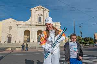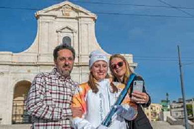 14-12-2025. Viaggio della fiamma olimpica delle olimpiadi invernali di Milano/Cortina 2026, per le vie di Cagliari, Sardegna, Italia. Foto Salvatore Moi/Agenzia Aldo Liverani s.as. Nella foto: Francesca Zucca Basilica Nostra Signora Madonna di Bonaria Cagliari con i genitori ©MOI SALVATORE - AGENZIA ALDO LIVERANI SAS