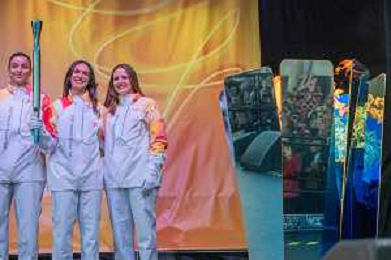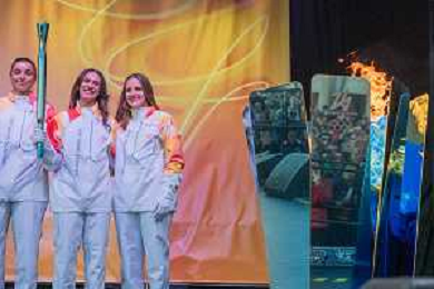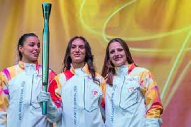 14-12-2025. Viaggio della fiamma olimpica delle olimpiadi invernali di Milano/Cortina 2026, per le vie di Cagliari, Sardegna, Italia. Foto Salvatore Moi/Agenzia Aldo Liverani s.as. Nella foto: Giulia Stagno, Francesca Zucca, Dalia Kaddari in via Roma Cagliari ©MOI SALVATORE - AGENZIA ALDO LIVERANI SAS