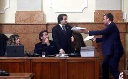 IMOLA 18 12 2025 CONSIGLIO COMUNALE SINDACO MARCO PANIERI ANNUNCIA in Consiglio Comunale che si e’ appena conclusa, la vicenda dell’ammanco di 200mila euro ad Area Blu S.p.A. con un risultato chiaro e netto: restituzione totale del maltolto e risarcimento dei danni alla societa’ e al Comune. NELLA FOTO SINDACO MARCO PANIERI CONSEGNA I DOCUMENTI ALL’ OPPOSIZIONE FRATELLI D'ITALIA MARIA TERESA MERLI NICHOLAS VACCHI SIMONE CARAPIA E SERENA BUGANI ©SANNA - AGENZIA ALDO LIVERANI SAS