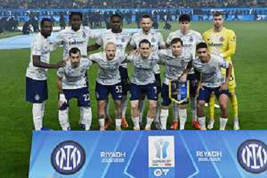 TVRG Bologna vs Inter nella foto formazione Inter, in piedi da SX Marcus Thuram (Inter), Yann Aurel Bisseck (Inter), Ange-Yoan Bonny (Inter), Stefan de Vrij (Inter), Alessandro Bastoni (Inter) e Josep Martinez (Inter); in basso da SX Henrikh Mkhitaryan (Inter), Federico Dimarco (Inter), Piotr Zielinski (Inter), Nicolò Barella (Inter) e Luis Henrique de Lima (Inter) Riyadh (KSA) 19-12-2025 Al-Awwal Park Stadium Bologna vs Inter Semifinale EA Sports Supercup - Supercoppa Italiana foto Roberto Garavaglia/Agenzia Aldo Liverani sas