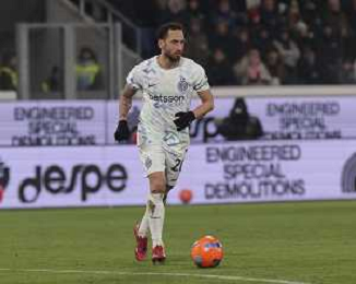 Hakan Calhanoglu of Inter FC play the ball during Atalanta BC vs Internazionale FC, 17° Serie A Enilive 2025-26 game at New Balance arena in Bergamo (BG), Italy, on Dicember 28, 2025. (Photo by Davide Casentini)- AGENZIA ALDO LIVERANI SAS