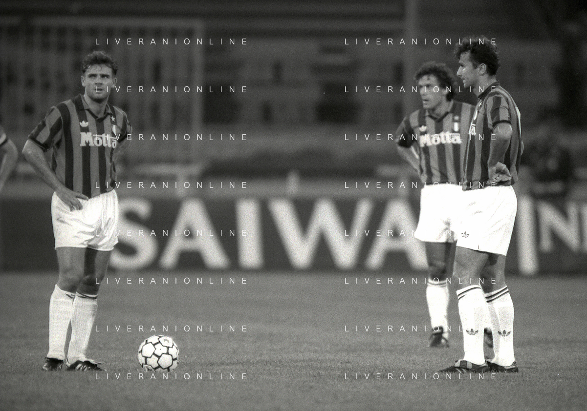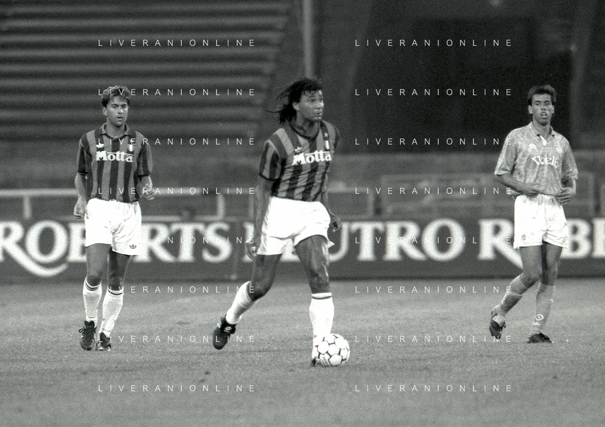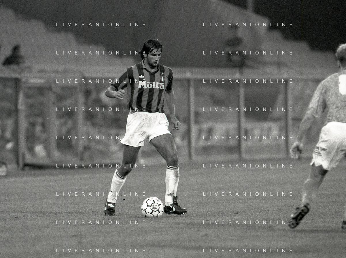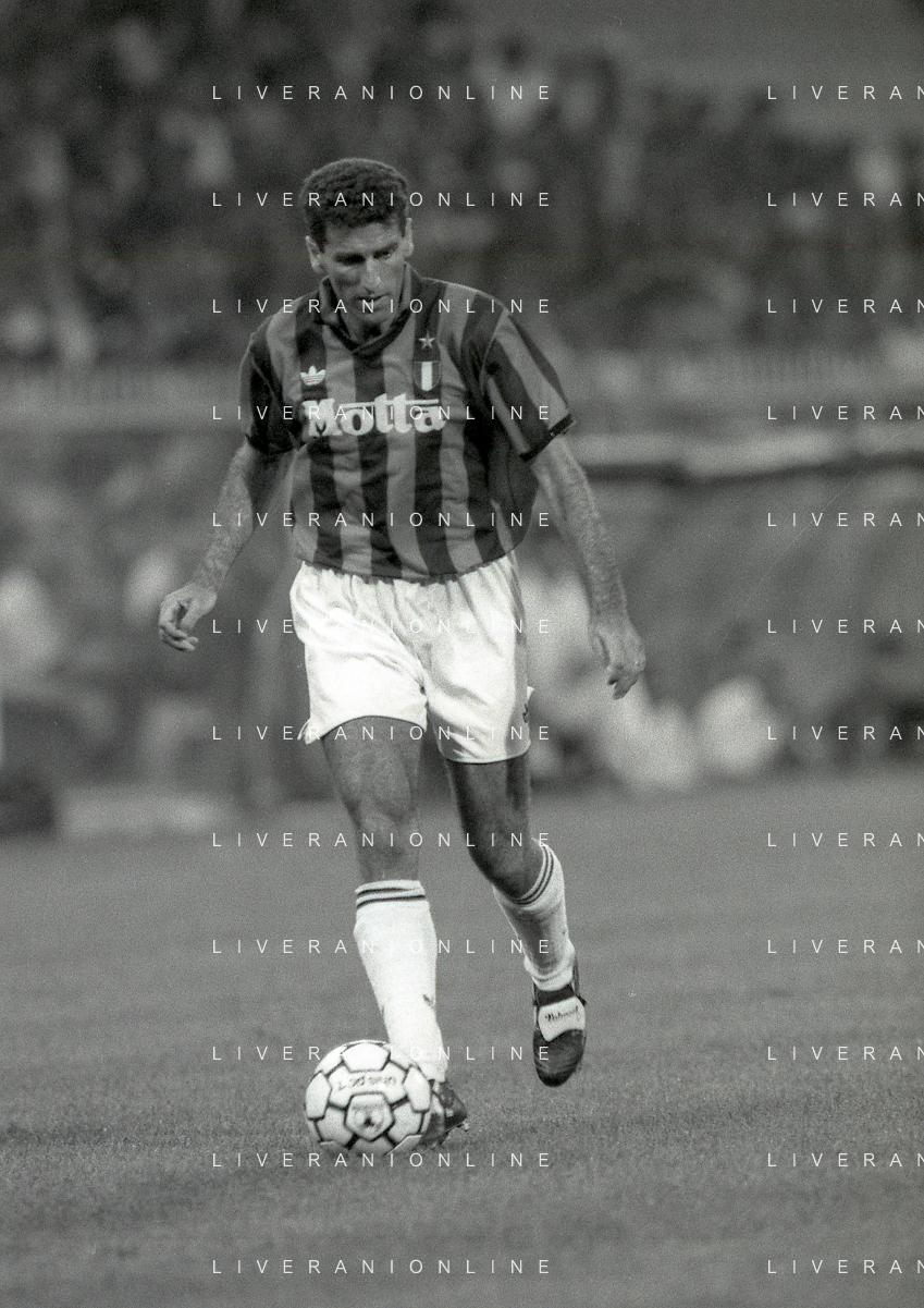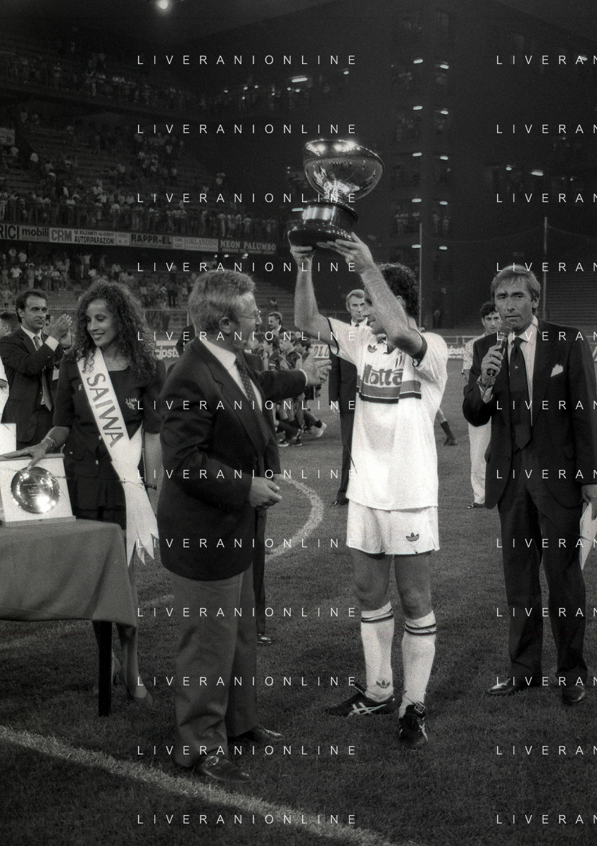 NEG-12-08-1992 GENOVA -TRIANGOLARE DEL MEDITERRANEO CON MILAN-GENOA E NAPOLI NELLA FOTO PREMIAZIONE FRANCO BARESI CAPITANO DEL MILAN AG ALDO LIVERANI SAS