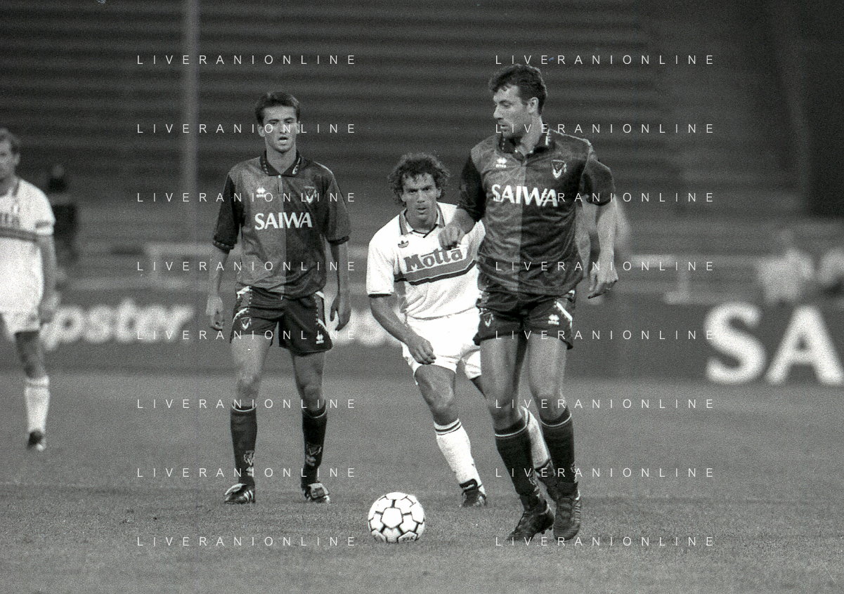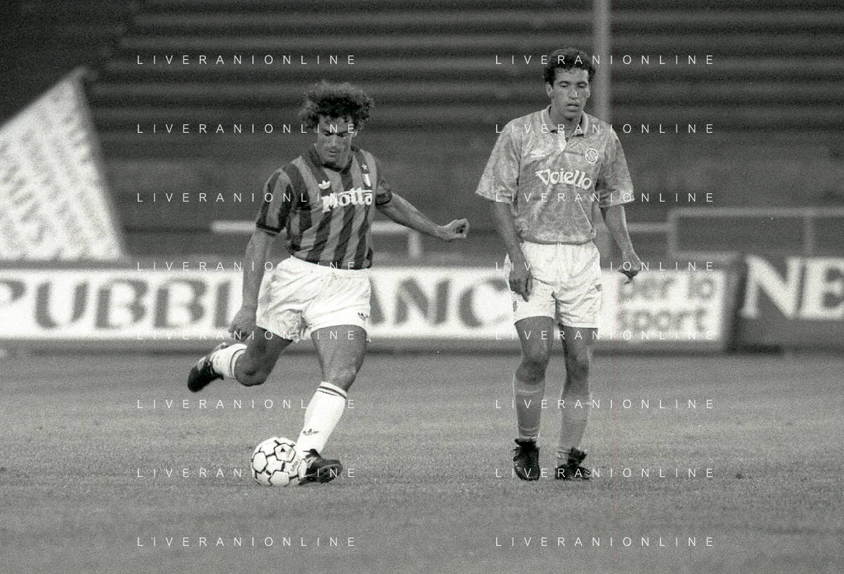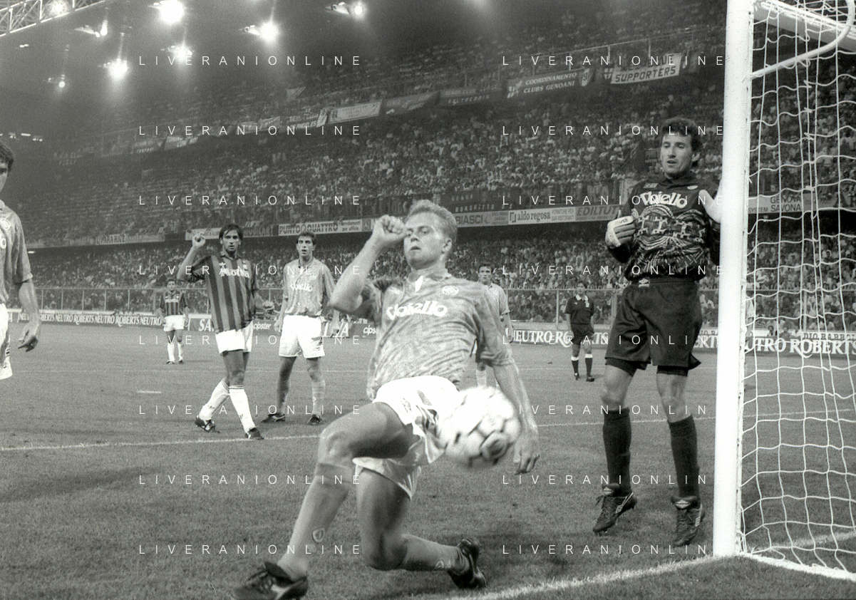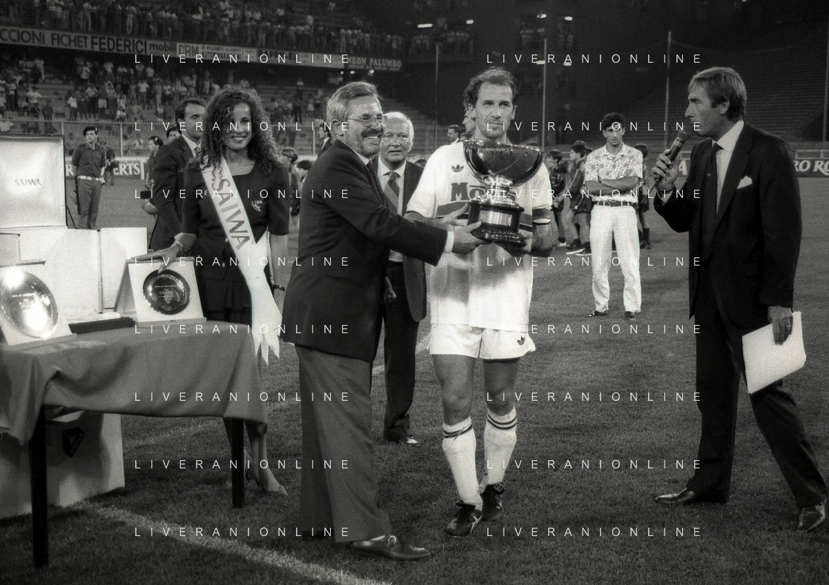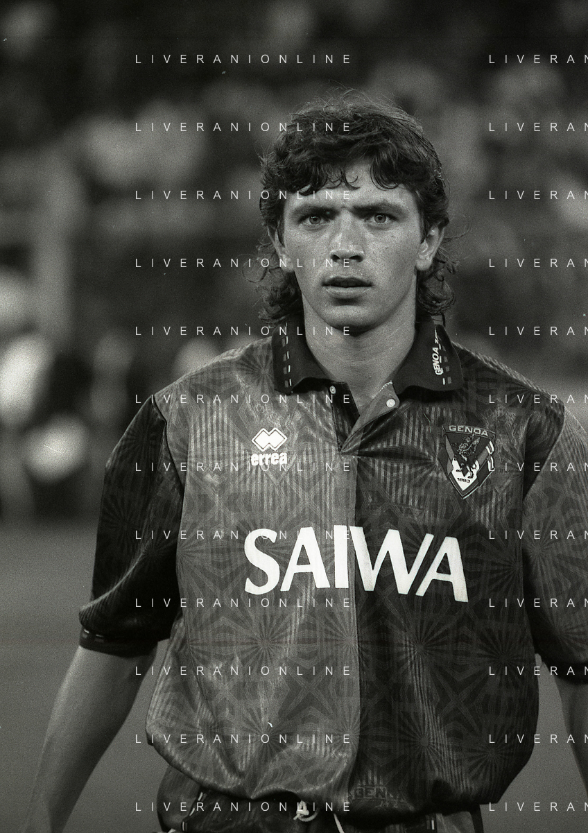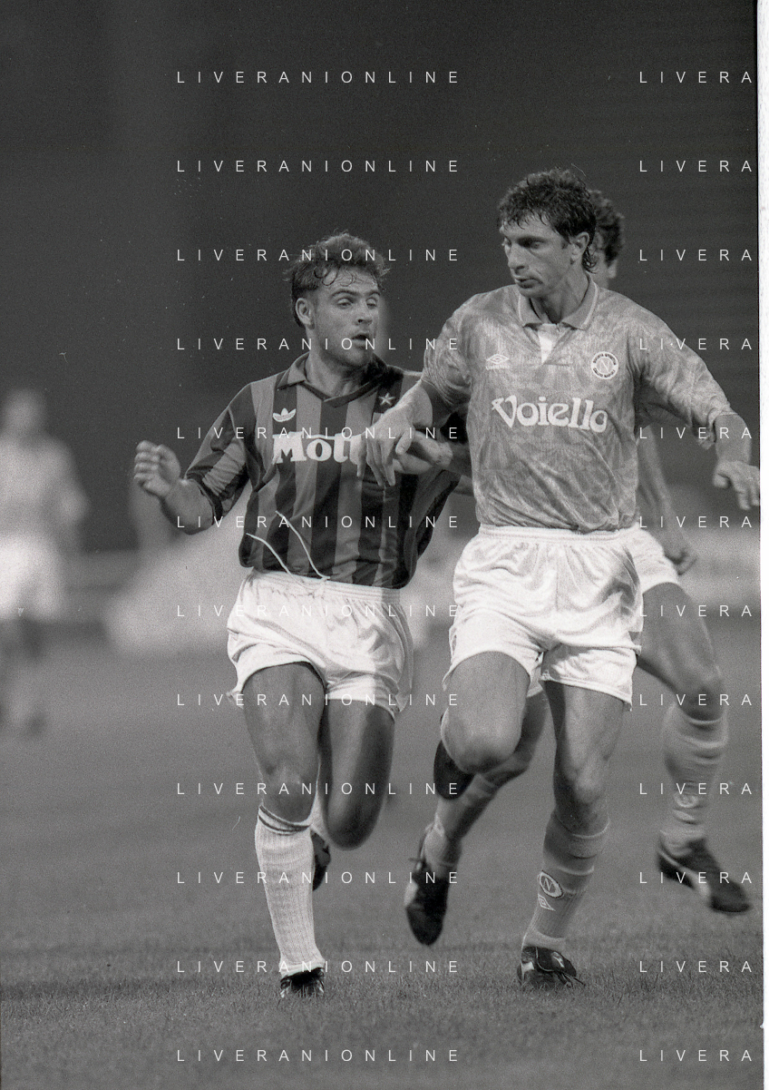 NEG-12-08-1992 GENOVA -TRIANGOLARE DEL MEDITERRANEO CON MILAN-GENOA E NAPOLI NELLA FOTO PREMIAZIONE FRANCO BARESI CAPITANO DEL MILAN AG ALDO LIVERANI SAS