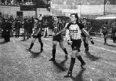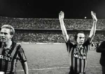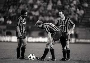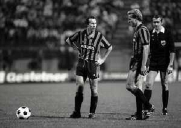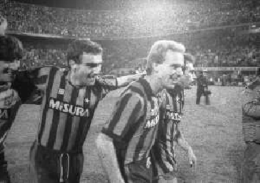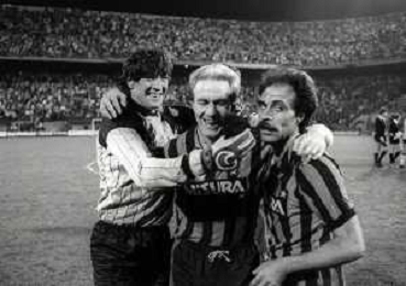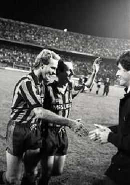 NEG-03-10-1984 MILANO- TRENTADUESIMI DI FINALE DI COPPA UEFA INTER-SPORTFUL STUDENTESC 2-0 NELLA FOTO WALTER ZENGA CON KARL HEINZE RUMMENIGGE E FRANCO CAUSIO AG ALDO LIVERANI SAS