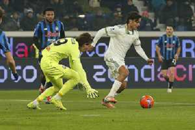 TVRG Atalanta vs Roma nella foto Marco Carnesecchi (Atalanta) para la conclusione ravvicinata di Matias Soulé (Roma) Bergamo 03-01-2026 New Balance Arena - Stadio di Bergamo Atalanta vs Roma Campionato Serie A Enilive - 18a giornata foto Roberto Garavaglia/Agenzia Aldo Liverani sas