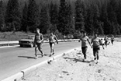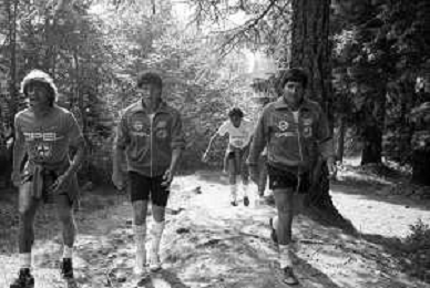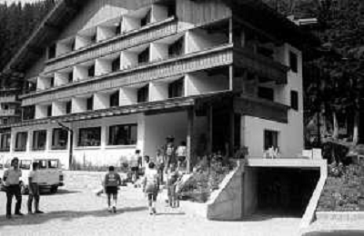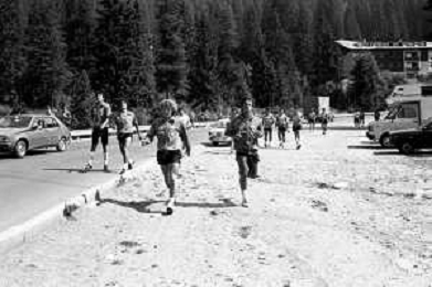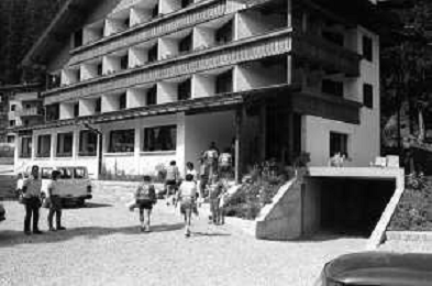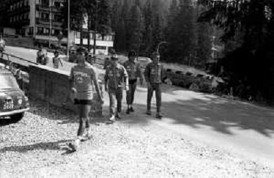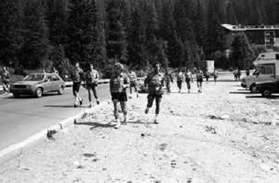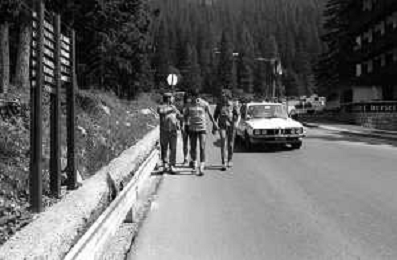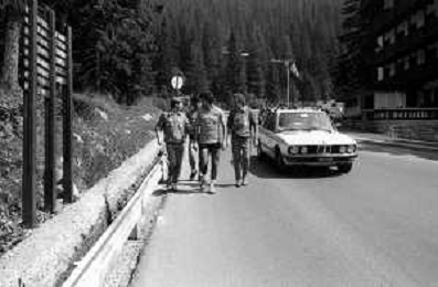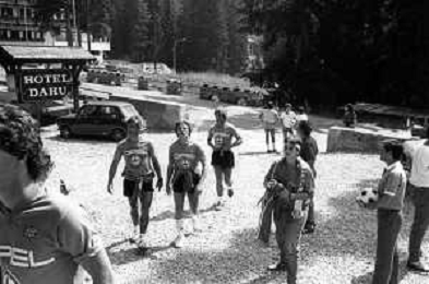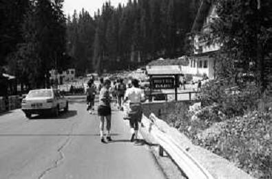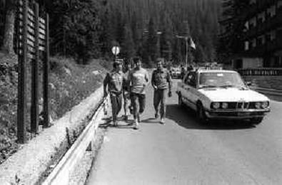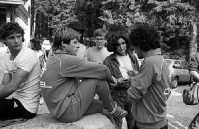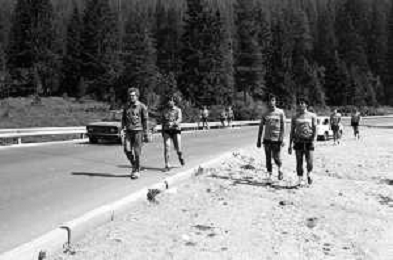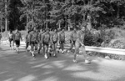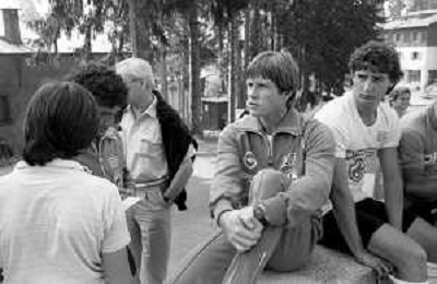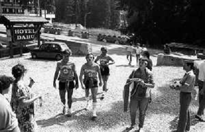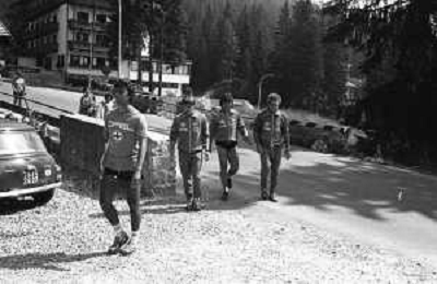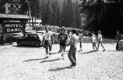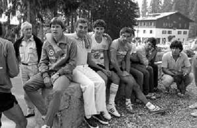 NEG- FIORENTINA CALCIO RITIRO ESTIVO PRECAMPIONATO MADONNA DI CAMPIGLIO 1983 NELLA FOTO I GIOCATORI RIENTRANO IN HOTEL AGENZIA ALDO LIVERANI SAS