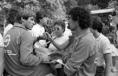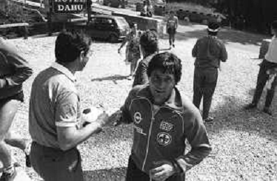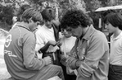NEG- FIORENTINA CALCIO RITIRO ESTIVO PRECAMPIONATO MADONNA DI CAMPIGLIO 1983 NELLA FOTO GABRIELE ORIALI FIRMA AUTOGRAFI AI TIFOSI AGENZIA ALDO LIVERANI SAS