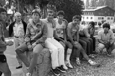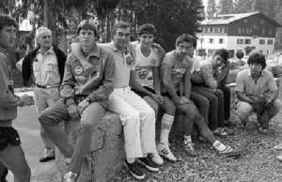 NEG- FIORENTINA CALCIO RITIRO ESTIVO PRECAMPIONATO MADONNA DI CAMPIGLIO 1983 NELLA FOTO L’ALLENATORE IN SECONDA ARMANDO ONESTI CON LA SQUADRA AGENZIA ALDO LIVERANI SAS