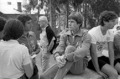 NEG- FIORENTINA CALCIO RITIRO ESTIVO PRECAMPIONATO MADONNA DI CAMPIGLIO 1983 NELLA FOTO L’ALLENATORE IN SECONDA ARMANDO ONESTI CON DANIEL PASSARELLA, ALESSANDRO BERTONI E PAOLO MONELLI AGENZIA ALDO LIVERANI SAS