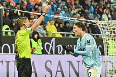 17-1-2026. Cagliari calcio-Juventus F.C., 21° giornata serie A 2025/2026, campionato calcio Italia, stadio Unipol Domus Cagliari. Foto Salvatore Moi/Agenzia Aldo Liverani s.as. Nella foto: arbitro Davide Massa ammonisce Kenan Yildiz Juventus ©MOI SALVATORE - AGENZIA ALDO LIVERANI SAS