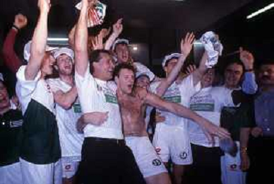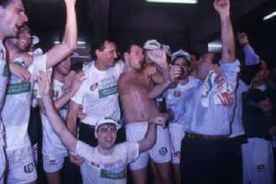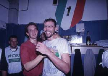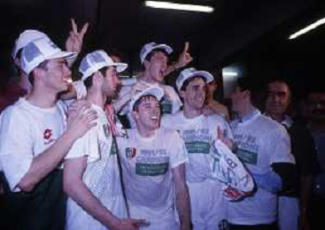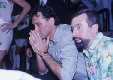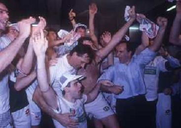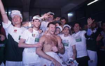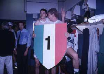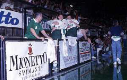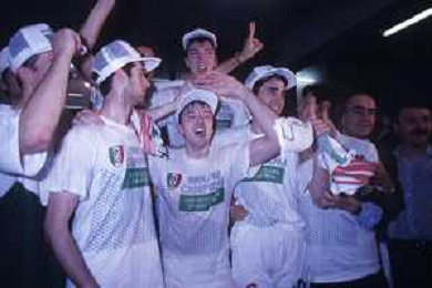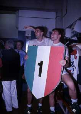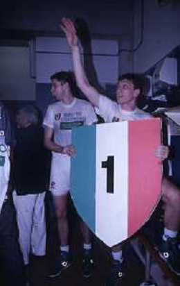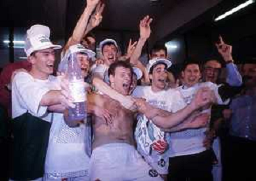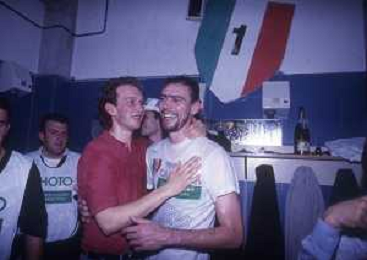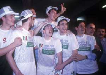 DIAP-1992-1 SCUDETTO VINTO DALLA BENETTON TREVISO BASKET NELLA FOTO I FESTEGGIAMNTI DEI GIOCATORI DELLA BENETTON BASKET DOPO AVER CONQUISTATO LO SCUDETTO A MILANO NELL'ANNO 1992 AG ALDO LIVERANI SAS