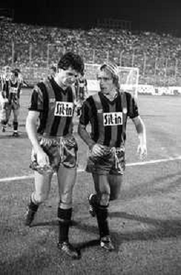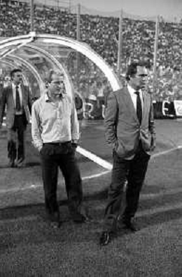NEG-RETROSPETTIVA COPPA ITALIA 1984-1985 ATALANTA vs JUVENTUS 2 : 2 BERGAMO 02.09.1984 NELLA FOTO L’ALLENATORE GIOVANNI TRAPATTONI CON NEDO SONETTI AGENZIA ALDO LIVERANI SAS