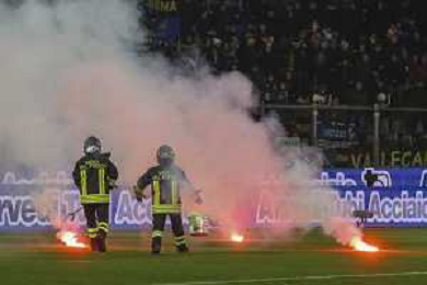 vigili del fuoco tentano di spegnere i fumogeni gettati in campo - the Fireman take the torch before US Cremonese vs Internazionale FC, 23° Serie A Enilive 2025-26 game at Giovanni Zini stadium in Cremona (CR), Italy, on January 25, 2026. (Photo by Davide Casentini)I- AGENZIA ALDO LIVERANI SAS