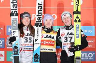 Abigail STRATE, CAN, bib number 35, Podium photo, Women's Large Hill HS137 at Viessmann FIS Ski Jumping World Cup 2025-26 in Sapporo, Japan, 2026-01-24, Photo Credit: action press / Taro Tampo AG KARMAPRESS-AG ALDO LIVERANI SAS