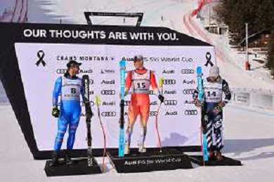 Dominik PARIS, bib number 8, ITA, Podium Photo Franjo VON ALLMEN, bib number 15, SUI, Podium Photo Ryan COCHRAN-SIEGLE, bib number 14, USA, Podium Photo, Men's Downhill at Audi FIS Ski World Cup 2025-26 in Crans Montana, Switzerland, 2026-02-01, Photo Credit: action press / Pierre Teyssot AG KARMAPRESS-AG ALDO LIVERANI SAS