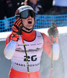 Lars ROESTI, bib number 26, SUI, Finish Line, Men's Downhill at Audi FIS Ski World Cup 2025-26 in Crans Montana, Switzerland, 2026-02-01, Photo Credit: action press / Pierre Teyssot AG KARMAPRESS-AG ALDO LIVERANI SAS