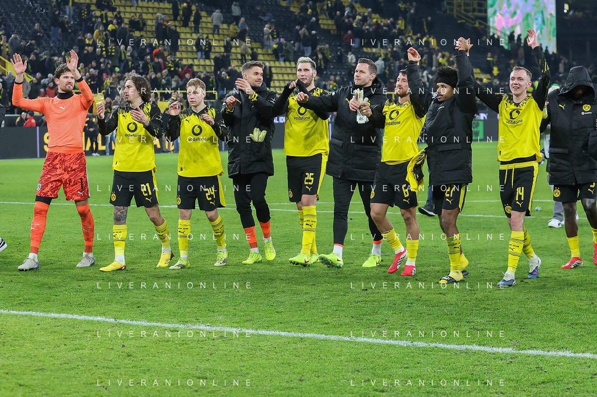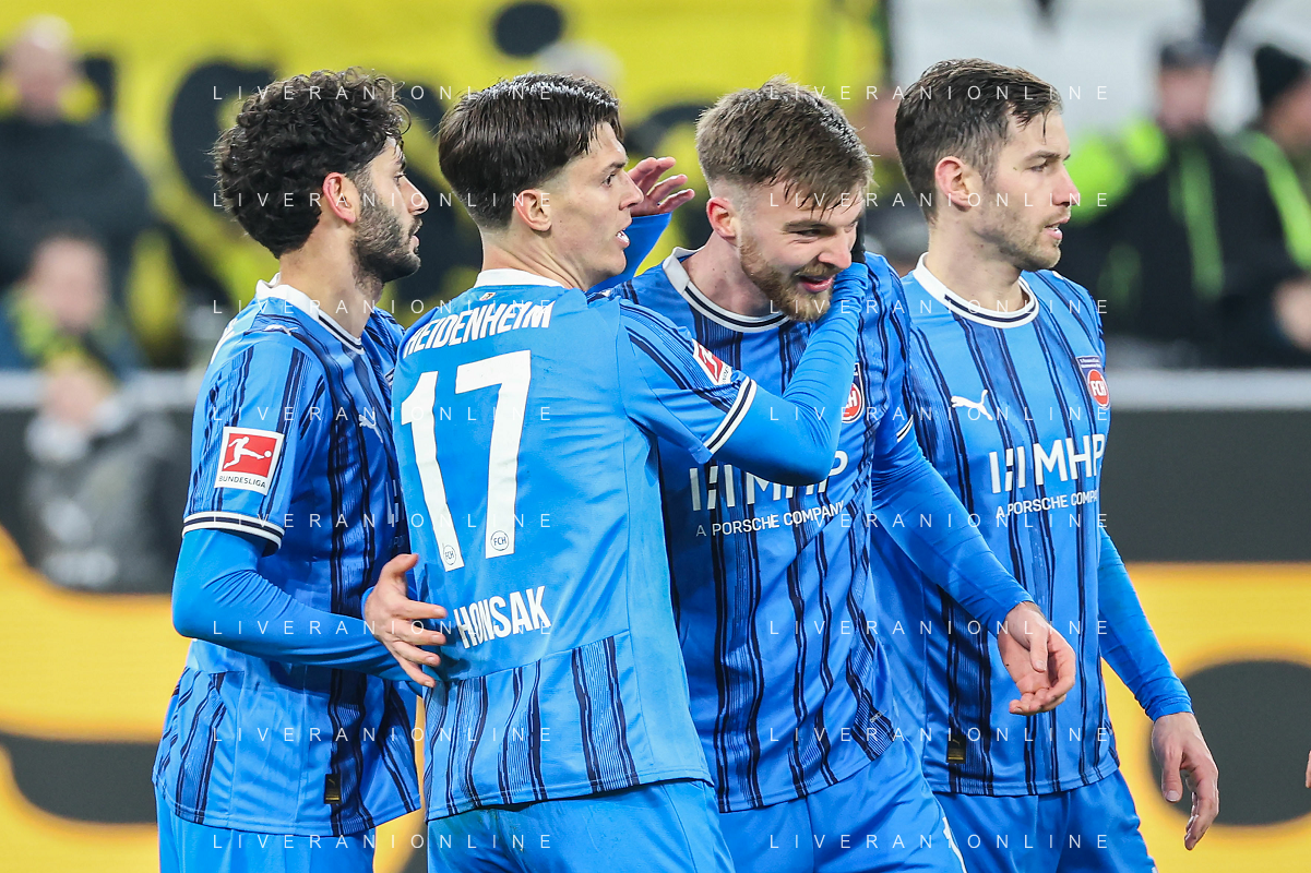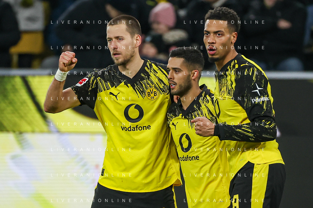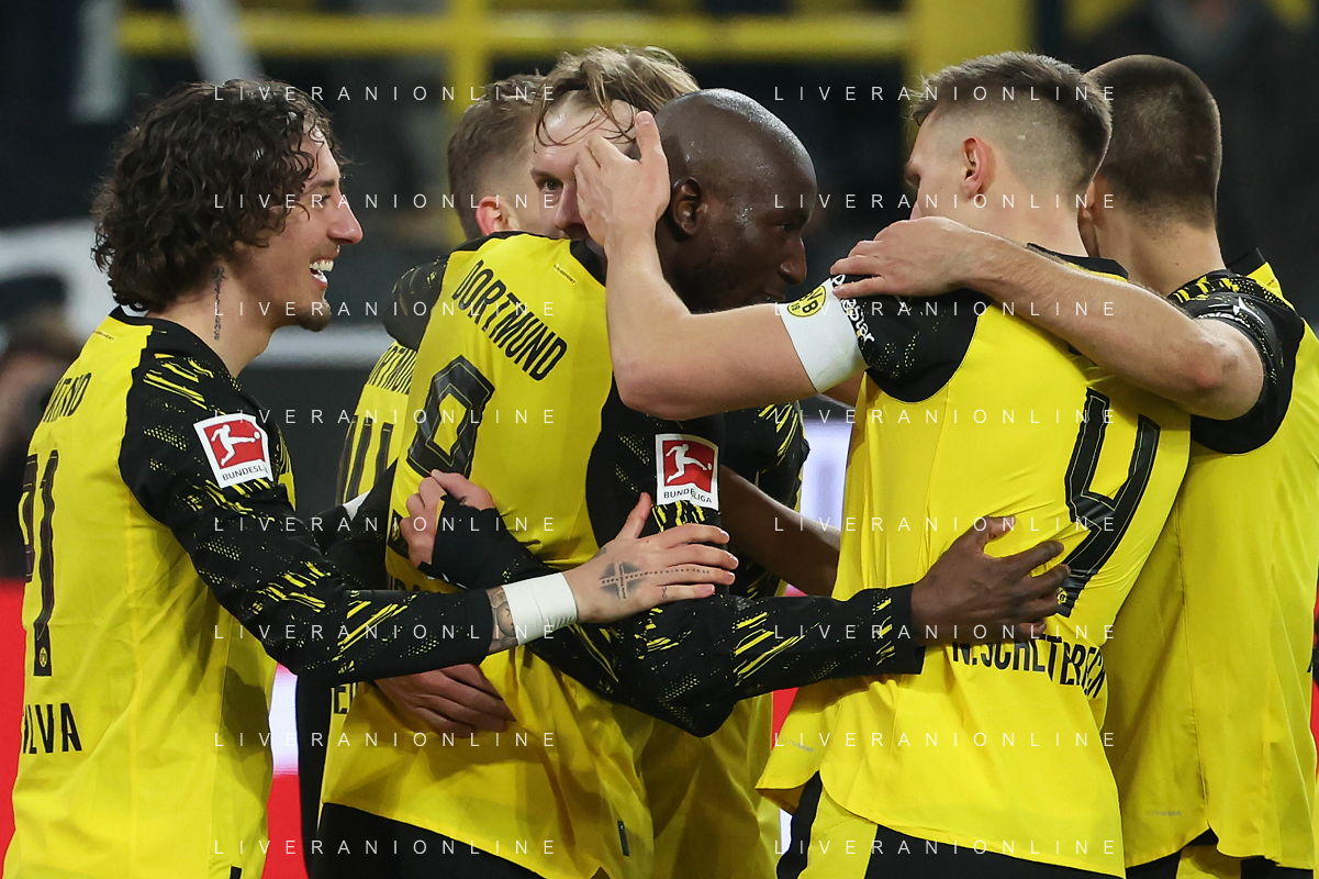 1. Bundesliga - Borussia Dortmund - 1. FC Heidenheim am 01.02.2026 im Signal Iduna Park in Dortmund Jubel, Torjubel, Torschuetze, Torschütze Serhou Guirassy (Dortmund 9) jubelt nach seinem Tor zum 3 zu 2 mit der Mannschaft, hier mit Fabio Silva (Dortmund 21), Julian Brandt (Dortmund 10), Nico Schlotterbeck (Dortmund 4), Waldemar Anton (Dortmund 3) Foto: osnapix / Marcus Hirnschal DFL regulations prohibit any use of photographs as image sequences and/or quasi-video / action press/Karmapress-Ag. Aldo Liverani Sas