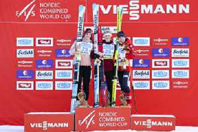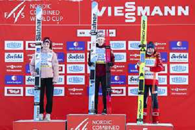 Stefan RETTENEGGER, AUT, bib number 52, Johannes LAMPARTER, AUT, bib number 53, Andreas SKOGLUND, NOR, bib number 55, Podium Photo, Women's Individual Mass Start Normal Hill HS109/5,0 Km at Viessmann FIS Nordic Combined World Cup 2025-26 in Seefeld, Austria, 2026-01-30, Photo Credit: action press / Julia Piatkowska AG KARMAPRESS-AG ALDO LIVERANI SAS