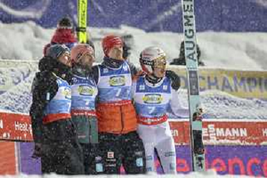 Pius PASCHKE, GER, bib number 7-1, Felix HOFFMANN, GER, bib number 7-2, Karl GEIGER, GER, bib number 7-3, Philipp RAIMUND, GER, bib number 7-4, Action Photo, Men's Team Flying Hill HS235 at Ski Jumping FIS Ski-Flying World Championships 2025-26 in Oberstdorf, Germany, 2026-01-25, Photo Credit: action press / Julia Piatkowska AG KARMAPRESS-AG ALDO LIVERANI SAS