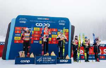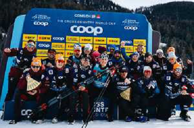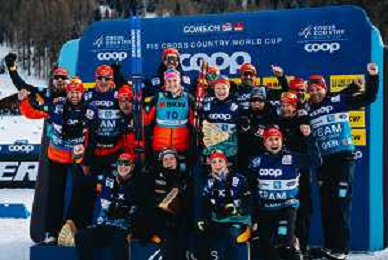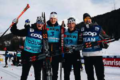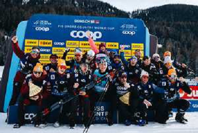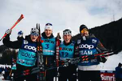 Gus SCHUMACHER, USA, and team USA, winner photo, Men's Sprint Final Classic at Coop FIS Cross-Country World Cup 2025-26 in Goms, Switzerland, 2026-01-24, Photo Credit: action press / Quentin Joly AG KARMAPRESS-AG ALDO LIVERANI SAS