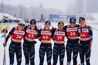 Jessie DIGGINS, USA, Johanna MATINTALO, FIN, Astrid Oeyre SLIND, NOR, Kerttu NISKANEN, FIN, Katharina HENNIG DOTZLER, GER, Karoline SIMPSON-LARSEN, NOR, podium photo, Women's 20km Mass Start Classic at Coop FIS Cross-Country World Cup 2025-26 in Goms, Switzerland, 2026-01-25, Photo Credit: action press / Quentin Joly AG KARMAPRESS-AG ALDO LIVERANI SAS