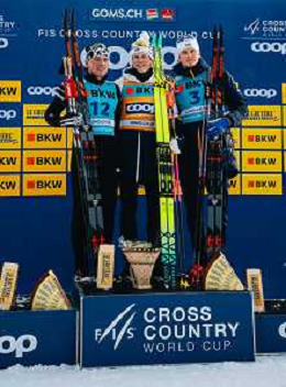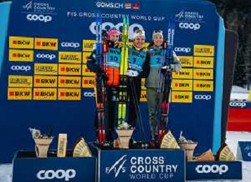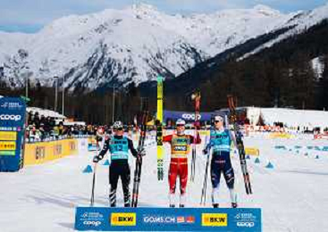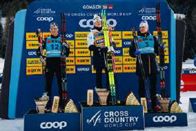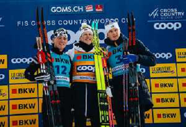 Gus SCHUMACHER, USA, Johannes Hoesflot KLAEBO, NOR, Edvin ANGER, SWE, podium photo, Men's Sprint Final Classic at Coop FIS Cross-Country World Cup 2025-26 in Goms, Switzerland, 2026-01-24, Photo Credit: action press / Quentin Joly AG KARMAPRESS-AG ALDO LIVERANI SAS