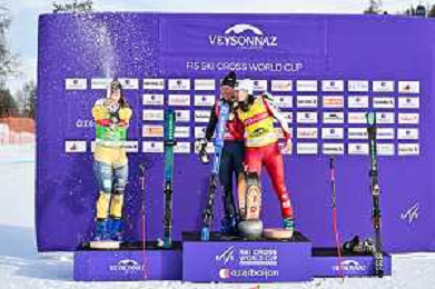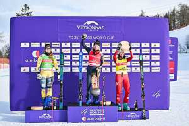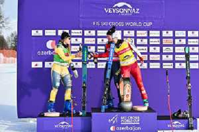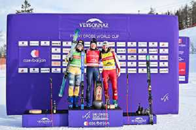podium photo, Women's Ski Cross at FIS Ski Cross World Cup 2025-26 in Veysonnaz, Switzerland, 2026-01-23, Photo Credit: action press / Frederic Dubuis AG KARMAPRESS-AG ALDO LIVERANI SAS