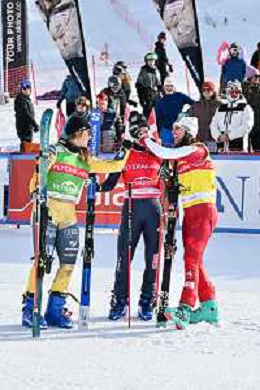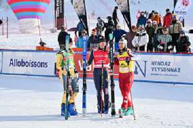 Reece HOWDEN, CAN, Youri DUPLESSIS-KERGOMARD, FRA, Tobias BAUR, SUI, podium photo, Men's Ski Cross at FIS Ski Cross World Cup 2025-26 in Veysonnaz, Switzerland, 2026-01-23, Photo Credit: action press / Frederic Dubuis AG KARMAPRESS-AG ALDO LIVERANI SAS