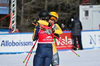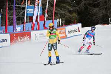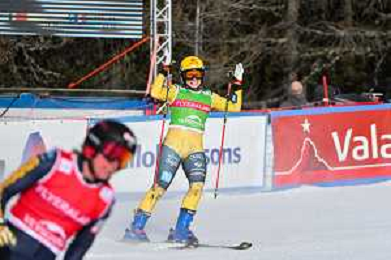 Sandra NAESLUND, SWE, bib number 1, Daniela MAIER, GER, bib number 6, winner photo, big final, Women's Ski Cross at FIS Ski Cross World Cup 2025-26 in Veysonnaz, Switzerland, 2026-01-23, Photo Credit: action press / Frederic Dubuis AG KARMAPRESS-AG ALDO LIVERANI SAS