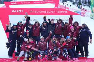 Paula MOLTZAN, Mikaela SHIFFRIN with Team USA, podium photo, Women's Giant Slalom at Audi FIS Ski World Cup 2025-26 in Spindleruv Mlyn, Czech Republic, 2026-01-24, Photo Credit: action press / Gabriel Kuchta AG KARMAPRESS-AG ALDO LIVERANI SAS