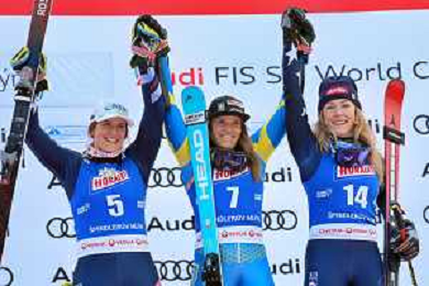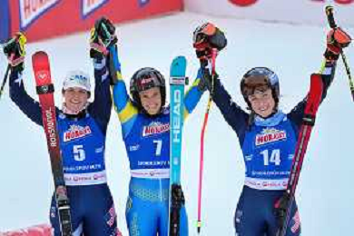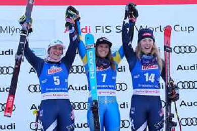 Paula MOLTZAN, USA, bib number 5, Sara HECTOR, SWE, bib number 7, Mikaela SHIFFRIN, USA, bib number 14, podium photo, Women's Giant Slalom at Audi FIS Ski World Cup 2025-26 in Spindleruv Mlyn, Czech Republic, 2026-01-24, Photo Credit: action press / Gabriel Kuchta AG KARMAPRESS-AG ALDO LIVERANI SAS