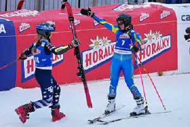 Mikaela SHIFFRIN, USA, bib number 14, Sara HECTOR, SWE, bib number 7, winner photo, Women's Giant Slalom at Audi FIS Ski World Cup 2025-26 in Spindleruv Mlyn, Czech Republic, 2026-01-24, Photo Credit: action press / Gabriel Kuchta AG KARMAPRESS-AG ALDO LIVERANI SAS