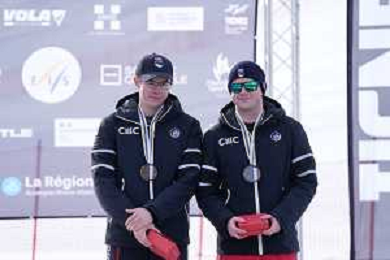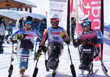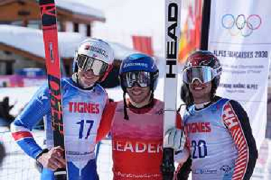 Arthur BAUCHET, FRA, Robin CUCHE, SUI, Alexis GUIMOND, CAN, Standing, winner photo, Men's Downhill at FIS Para Alpine Skiing World Cup 2025-26 in Tignes, France, 2026-02-05, Photo Credit: action press / Connor Owens AG KARMAPRESS-AG ALDO LIVERANI SAS