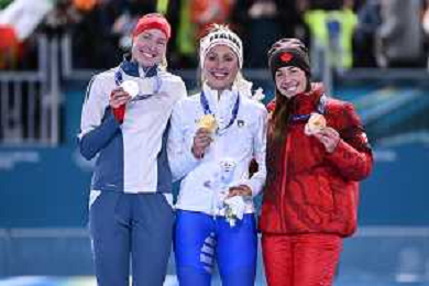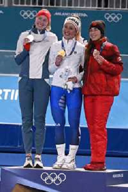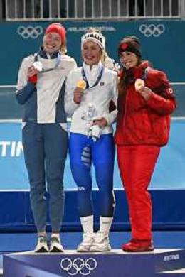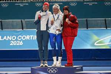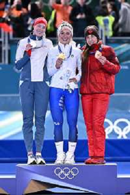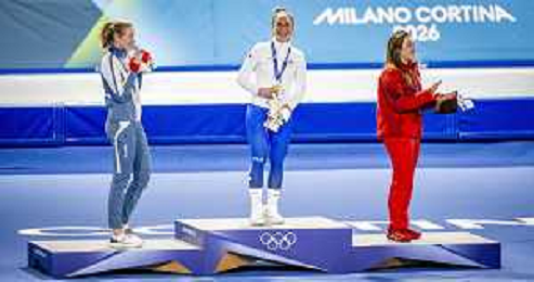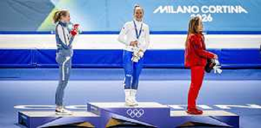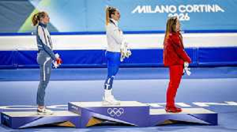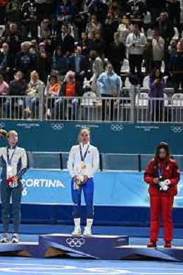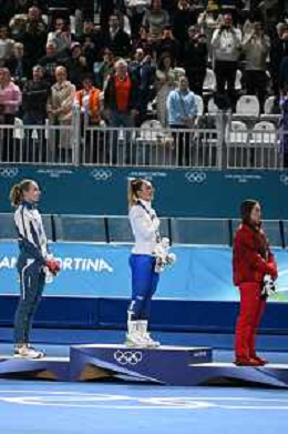 TVPG Olimpiadi invernali Milano Cortina 2026 Pattinaggio di velocità, nella foto il podio: Wiklund Ragne (Medaglia di Bronzo, Francesca Lollobrigida (Medaglia d'Oro), Maltais Valerie (medaglòia d'Argento, 6/22-02-2026 Milano 6/22-02-2026 Milano