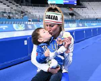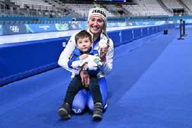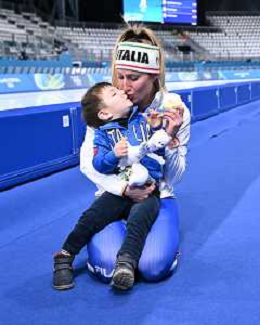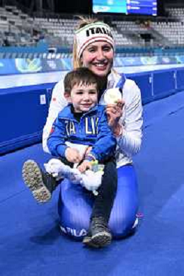Olimpiadi Milano Cortina 2026 nella foto Francesca Lollobrigida con il figlio Tommaso Milano RhoFiera 07-02-2026 Milano Ice Park - Speed Skating Stadium Finale 3.000 metri femminili pattinaggio di velocita’ XXV Giochi Olimpici invernali Milano Cortina 2026 foto Roberto Garavaglia/Agenzia Aldo Liverani sas