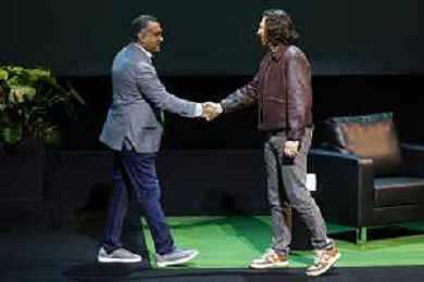2/6/2026 - San Francisco, California, USA: (From left) YouTube CEO Neal Mohan greets Acquired podcast co-hosts Ben Gilbert before having a sit-down conversation during the Bay Area Host Committee Super Bowl LX Innovation Summit held at Yerba Buena Gardens in San Francisco, California Friday, Feb. 6, 2026. (Jessica Christian / San Francisco Chronicle / Polaris)-KarmaPress- Agenzia Aldo Liverani Sas ITALY ONLY EDITORIAL USE ONLY