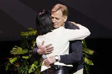 2/6/2026 - San Francisco, California, USA: Bay Area Host Committee President and CEO Zaileen Janmohamed greets NFL Commissioner Roger Goodell during the Bay Area Host Committee Super Bowl LX Innovation Summit held at Yerba Buena Gardens in San Francisco, California Friday, Feb. 6, 2026. (Jessica Christian / San Francisco Chronicle / Polaris)-KarmaPress- Agenzia Aldo Liverani Sas ITALY ONLY EDITORIAL USE ONLY