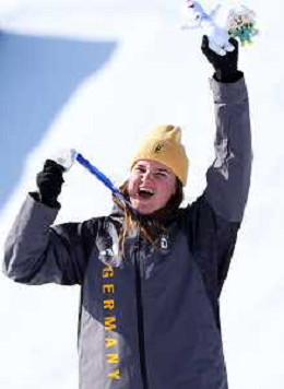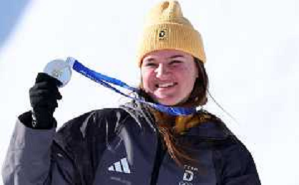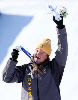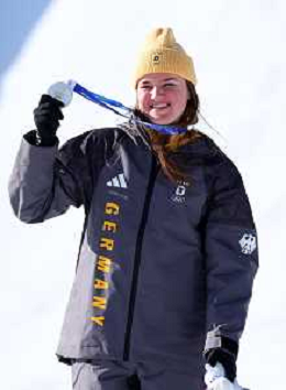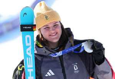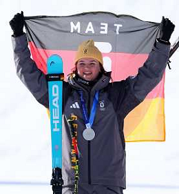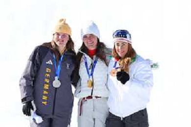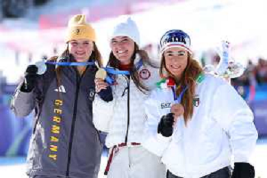 Emma AICHER, GER, bib number 10, Podium Photo, Women's Downhill at Alpine Skiing Olympic Winter Games 2025-26 in Milano-Cortina, Italy, 2026-02-08, Photo Credit: action press / Yohei Osada-KarmaPress- Agenzia Aldo Liverani Sas ITALY ONLY EDITORIAL USE ONLY