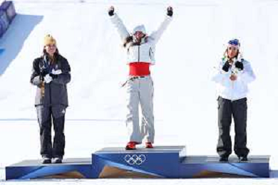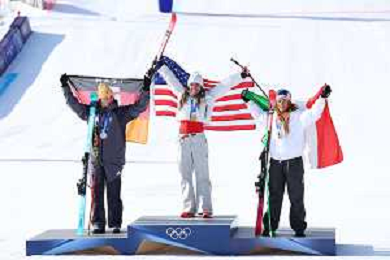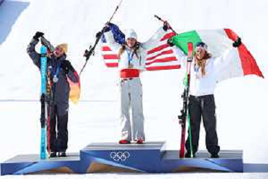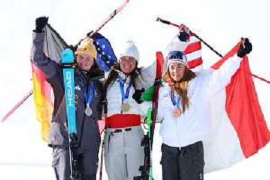 Breezy JOHNSON, USA, bib number 6, Winner Photo, Podium Photo, Action Photo, Emma AICHER, GER, bib number 10, Sofia GOGGIA, ITA, bib number 15, Women's Downhill at Alpine Skiing Olympic Winter Games 2025-26 in Milano-Cortina, Italy, 2026-02-08, Photo Credit: action press / Yohei Osada-KarmaPress- Agenzia Aldo Liverani Sas ITALY ONLY EDITORIAL USE ONLY
