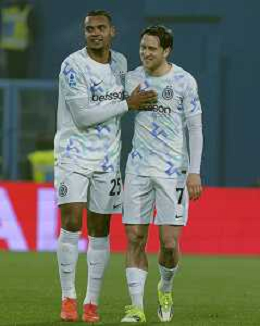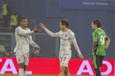 Manuel Akanji of Inter FC celebrates with team mate during US Sassuolo vs Internazionale FC, 24° Serie A Enilive 2025-26 game at Mapei stadium - Citta del Tricolore in Reggio nell'Emilia (RE), Italy, on February 08, 2026. (Photo by Davide Casentini)-AGENZIA ALDO LIVERANI SAS