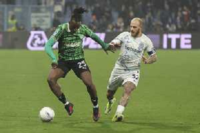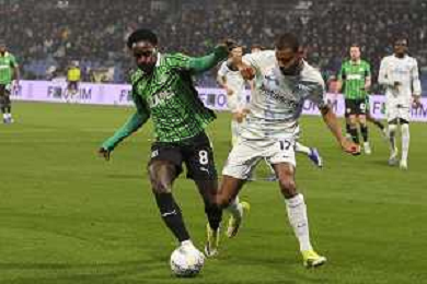M'Bala Nzola of US Sassuolo battle for the ball with Andy Diouf of Inter FC during US Sassuolo vs Internazionale FC, 24° Serie A Enilive 2025-26 game at Mapei stadium - Citta del Tricolore in Reggio nell'Emilia (RE), Italy, on February 08, 2026. (Photo by Davide Casentini)-AGENZIA ALDO LIVERANI SAS