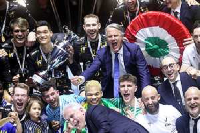 CASALECCHIO DI RENO (BOLOGNA)08 02 2026 FINALE COPPA ITALIA MASCHILE PALLAVOLO FINAL FOUR COPPA ITALIA SUPERLEGA MASCHILE RANA VERON-ITAS TRENTINO 3-0 NELLA FOTO PRESIDENTE STEFANO FANINI ESULTA CON LA SQUADRA DOPO LA VITTORIA FOTO GIANNI SANNA-AG ALDO LIVERANI SAS
