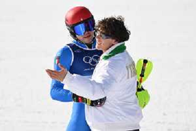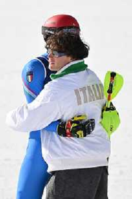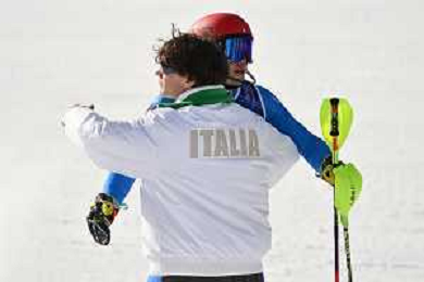 Olimpiadi Milano Cortina 2026 nella foto abbraccio tra Alex Vinatzer (ITA) e Giovanni Franzoni (ITA) a fine gara Bormio (SO) 09-02-2026 Stelvio Ski Center Slalom Speciale - Combinata maschile a squadre XXV Giochi Olimpici invernali Milano Cortina 2026 foto Roberto Garavaglia/Agenzia Aldo Liverani sas