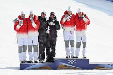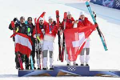 Olimpiadi Milano Cortina 2026 nella foto il podio, da SX Vincent Kriechmayr (AUT) e Manuel Feller (AUT) secondi a pari merito con Marco Odermatt (SVI) e Loic Meillard (SVI), a DX i vincitori Franjo von Allmen (SVI) e Tanguy Nef (SVI) Bormio (SO) 09-02-2026 Stelvio Ski Center Slalom Speciale - Combinata maschile a squadre XXV Giochi Olimpici invernali Milano Cortina 2026 foto Roberto Garavaglia/Agenzia Aldo Liverani sas