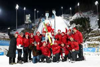 Anna Odine STROEM, NOR, bib nu 8-1, Kristoffer Eriksen SUNDAL, NOR, bib nu 8-2, Eirin Maria KVANDAL, NOR, bib nu 8-3, Action Photo, Mixed Team Normal Hill HS107 at Ski Jumping Olympic Winter Games 2025-26 in Milano Cortina, Italy, 2026-02-10, Photo Credit: action press / Julia Piatkowska AG KARMAPRESS-AG ALDO LIVERANI SAS