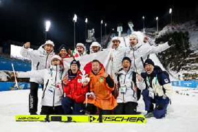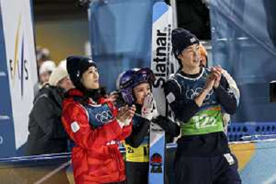 Nozomi MARUYAMA, JPN, bib nu 12-1, Ryoyu KOBAYASHI, JPN, bib nu 12-2, Sara TAKANASHI, JPN, bib nu 12-3, Action Photo, Mixed Team Normal Hill HS107 at Ski Jumping Olympic Winter Games 2025-26 in Milano Cortina, Italy, 2026-02-10, Photo Credit: action press / Julia Piatkowska AG KARMAPRESS-AG ALDO LIVERANI SAS