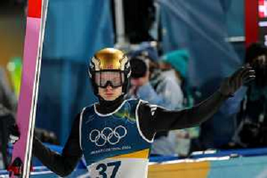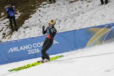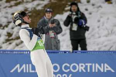Ren NIKAIDO, JPN, bib number 48, Winner Photo, Men's Normal Hill HS107 at Ski Jumping Olympic Winter Games 2025-26 in Milano Cortina, Italy, 2026-02-09, Photo Credit: action press / Julia Piatkowska/KarmaPress / AGENZIA ALDO LIVERANI SAS ITALY ONLY EDITORIAL USE ONLY