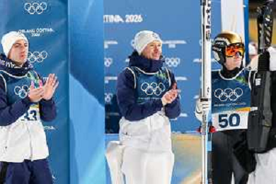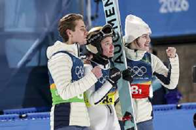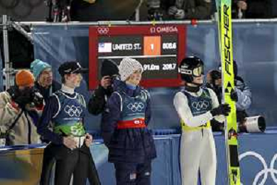 Annika BELSHAW, USA, bib nu 5-1, Jason COLBY, USA, bib nu 5-2, Paige JONES, USA, bib nu 5-3, Action Photo, Mixed Team Normal Hill HS107 at Ski Jumping Olympic Winter Games 2025-26 in Milano Cortina, Italy, 2026-02-10, Photo Credit: action press / Julia Piatkowska AG KARMAPRESS-AG ALDO LIVERANI SAS