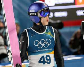 Ryoyu KOBAYASHI, JPN, bib number 49, Action Photo, Men's Normal Hill HS107 at Ski Jumping Olympic Winter Games 2025-26 in Milano Cortina, Italy, 2026-02-09, Photo Credit: action press / Julia Piatkowska/KarmaPress / AGENZIA ALDO LIVERANI SAS ITALY ONLY EDITORIAL USE ONLY