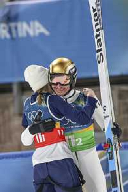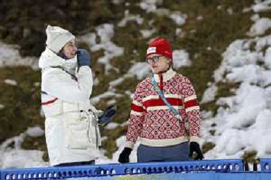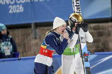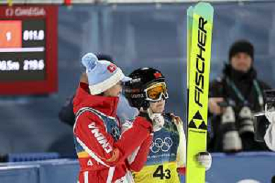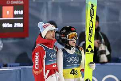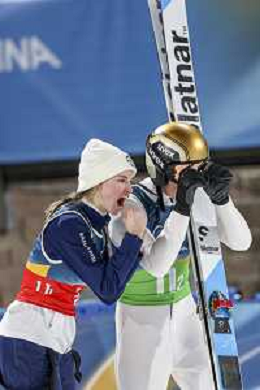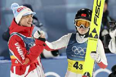 Ping ZENG, CHN, bib nu 4-1, Qi LIU, CHN, bib nu 4-3, Action Photo, Mixed Team Normal Hill HS107 at Ski Jumping Olympic Winter Games 2025-26 in Milano Cortina, Italy, 2026-02-10, Photo Credit: action press / Julia Piatkowska AG KARMAPRESS-AG ALDO LIVERANI SAS